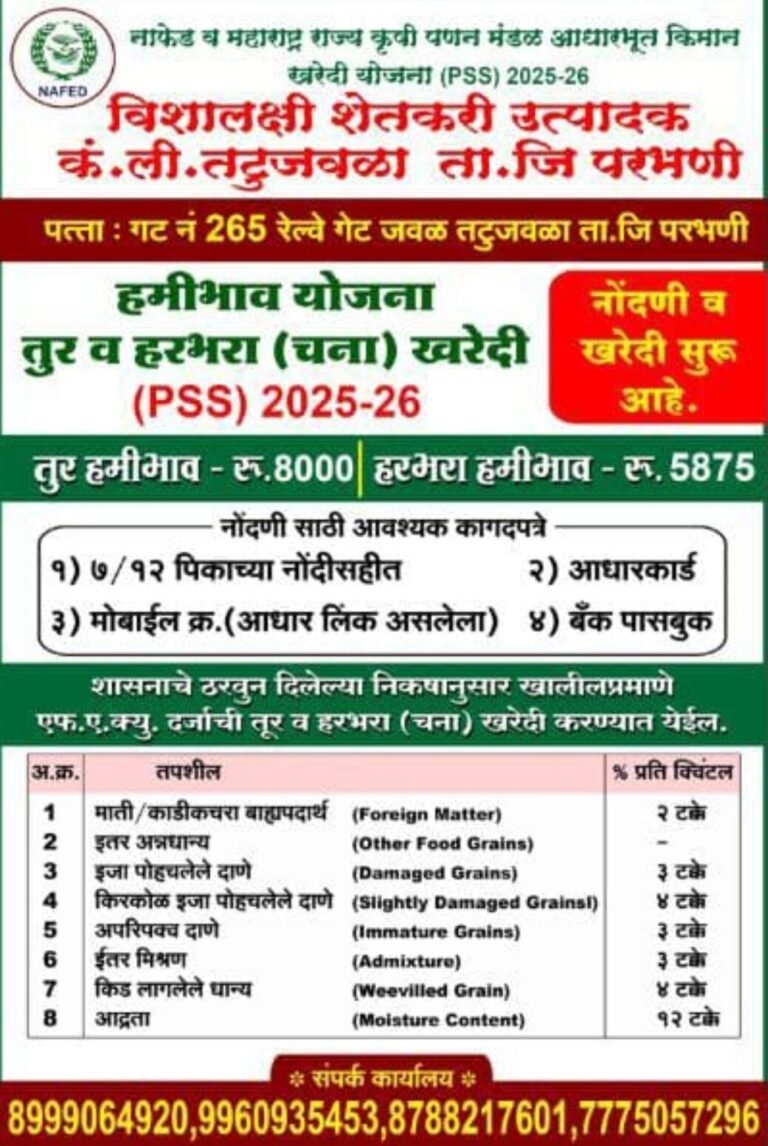 NAFED in collaboration with Maharashtra State Agricultural Marketing Board has initiated the procurement of Tur and Bengal Gram (Chana) under the Price Support Scheme (PSS) 2025 – 26 at Vishalakshi Farmers Producer Company Limited, Tattu Jawala, Parbhani. Farmers can register and sell their produce at the procurement centre as per government guidelines. The minimum support price (MSP) has been fixed at ₹8000 for Tur and ₹5875 for Bengal Gram (Chana). Farmers are requested to bring necessary documents such as 7/12 extract, aadhaar card, bank passbook, and aadhaar-linked mobile number for registration. This initiative aims to ensure fair pricing, reduce distress selling, and support farmers in securing better returns for their produce.