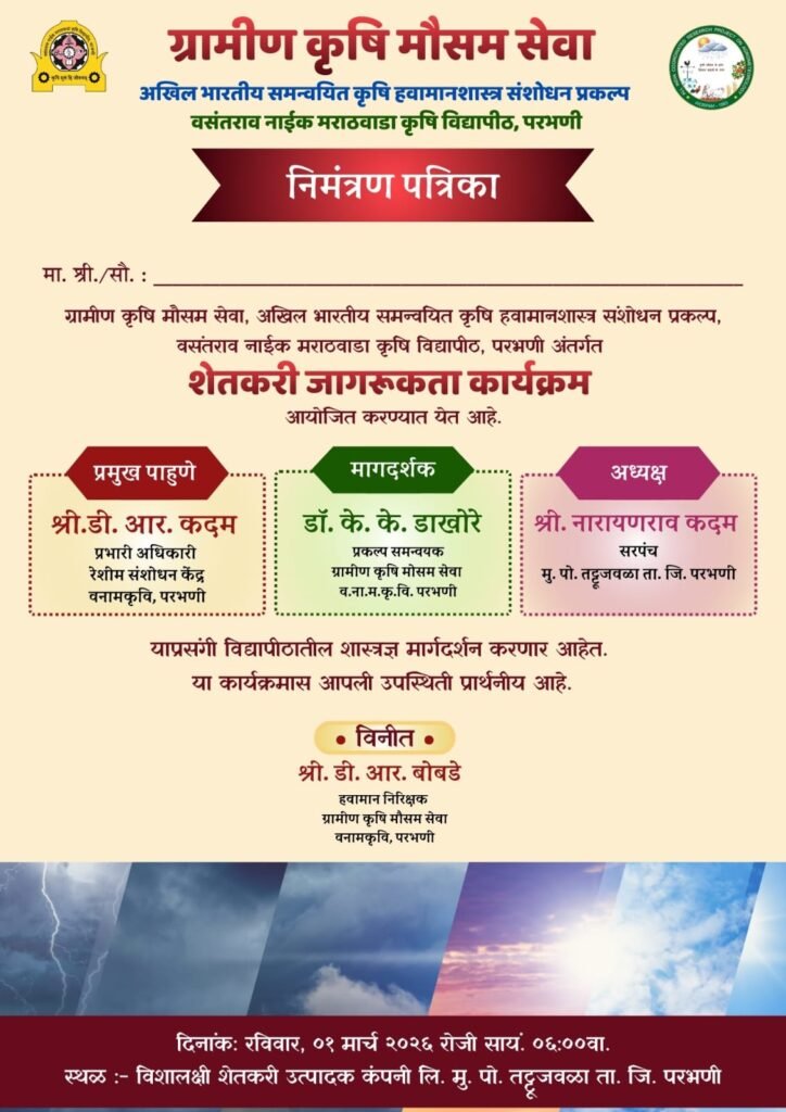 A Farmer Awareness Program has been organized under the Gramin Krushi Mausam Seva initiative by Vasantrao Naik Marathwada Krishi Vidyapeeth, Parbhani.